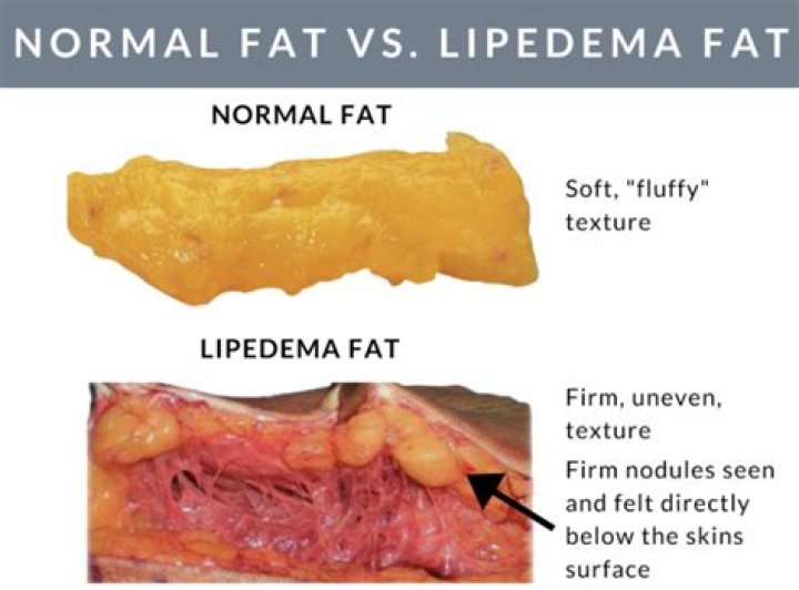 In rare cases, some women also show signs of lipedema in their upper arms. The fat itself is also different. Fat accumulation associated with being overweight is smooth with a rubbery texture. Lipedema fat is marble-like, knotty, or feels like little pearls to the touch.
