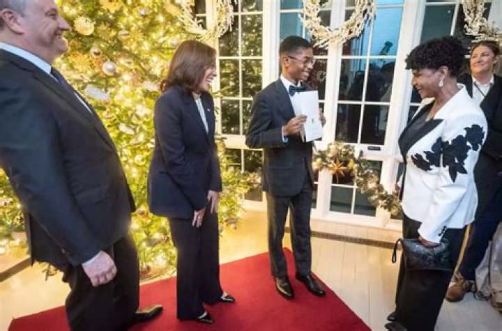 VP Kamala Harris and second man of his word Doug Emhoff rang in the colder time of year Christmas season with another companion, 15-year-old craftsman Alex Berko.