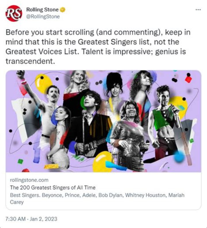 "Before you start scrolling (and commenting), keep in mind that this is the Greatest Singers list, not the Greatest Voices List. Talent is impressive; genius is transcendent," the publication wrote.
