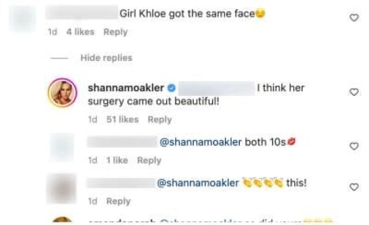 “Girl, Khloé got the same face,” one commenter wrote, to which Shanna responded, “I think her surgery came out beautiful!”