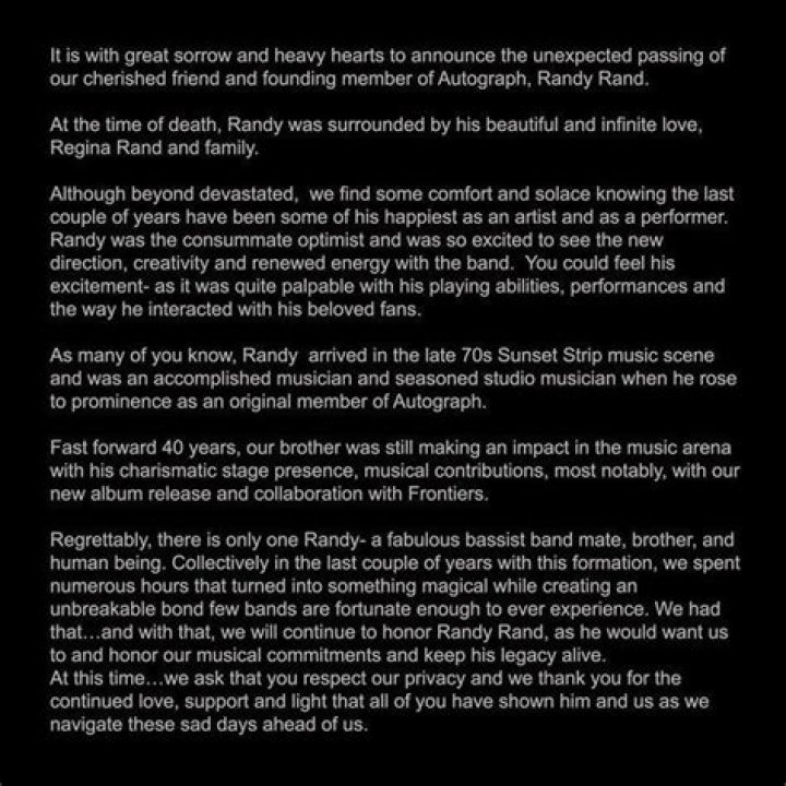 In the Facebook post of the band Autograph, they wrote, “It is with great sadness and heavy hearts to make the unexpected announcement of the passing of our friend and founding member of Autograph, Randy Rand.”