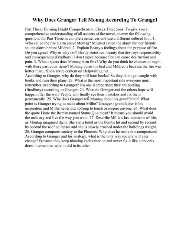 What is the most important rule everyone must follow according to Granger? No one is important and they are nothing, it is important to prevail life. What do Granger and the others hope will happen after the war? Why dose Granger tell Montag about his grandfather?