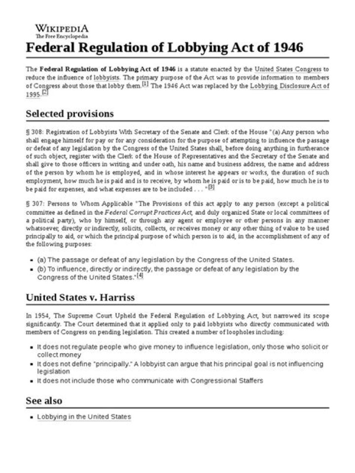 The Federal Regulation of Lobbying Act of 1946 is a statute enacted by the United States Congress to reduce the influence of lobbyists. The primary purpose of the Act was to provide information to members of Congress about those that lobby them.
